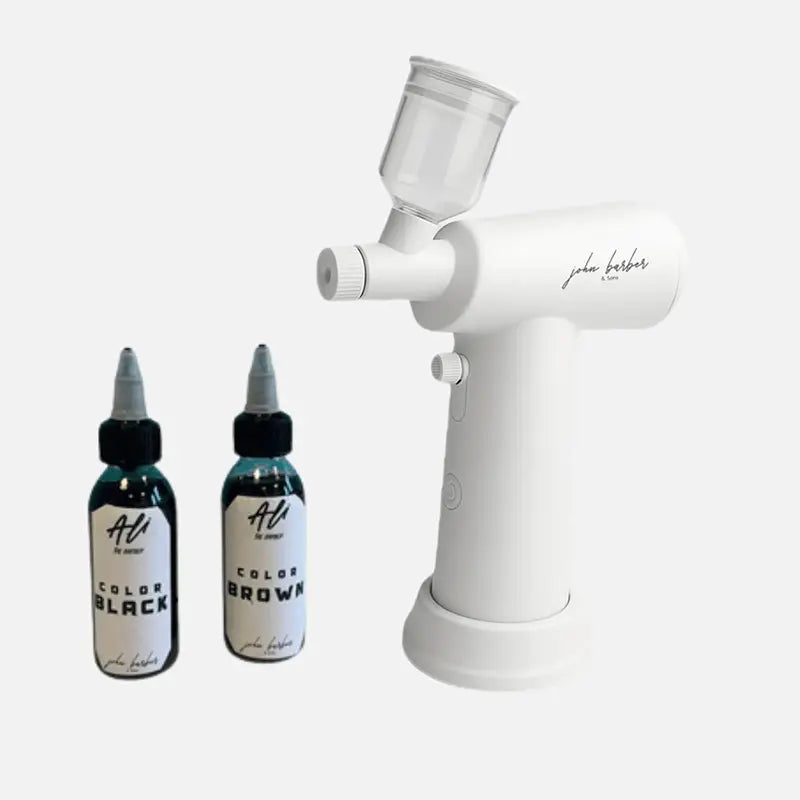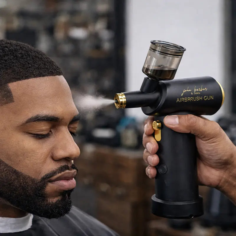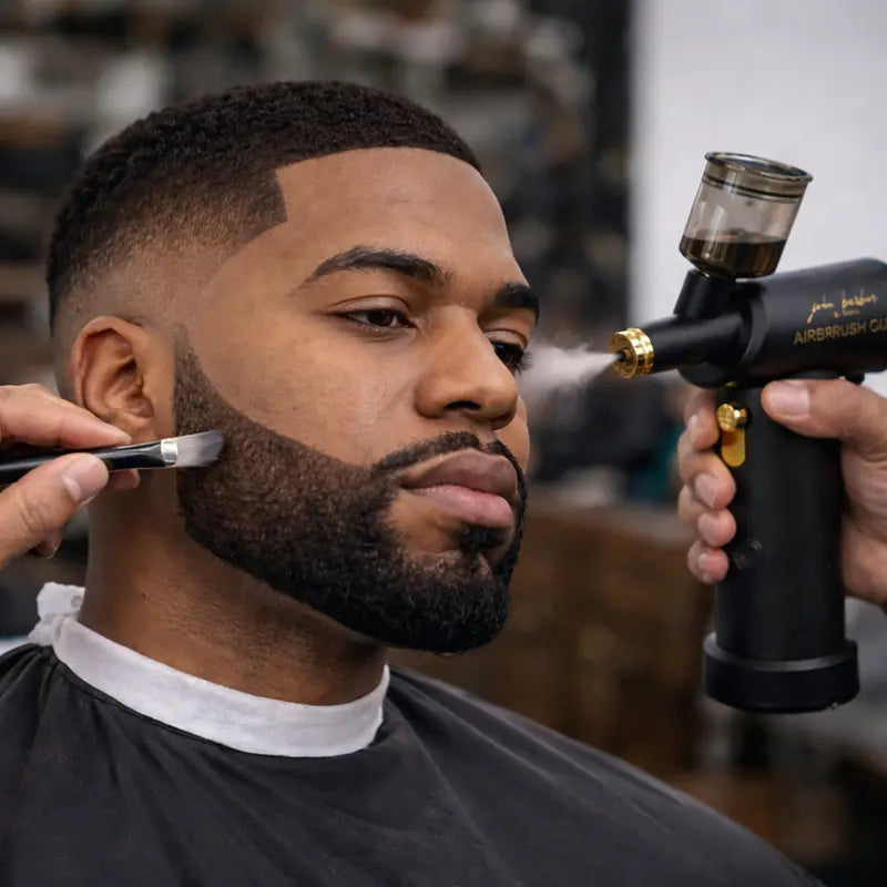Für Barbershops eignen sich spezielle, temporäre Airbrush-Farben auf Wasserbasis in Schwarz- und Brauntönen. Diese sollten dermatologisch getestet, schnelltrocknend und für den Hautkontakt zugelassen sein – normale Airbrush-Farben aus dem Kunstbereich sind ungeeignet.