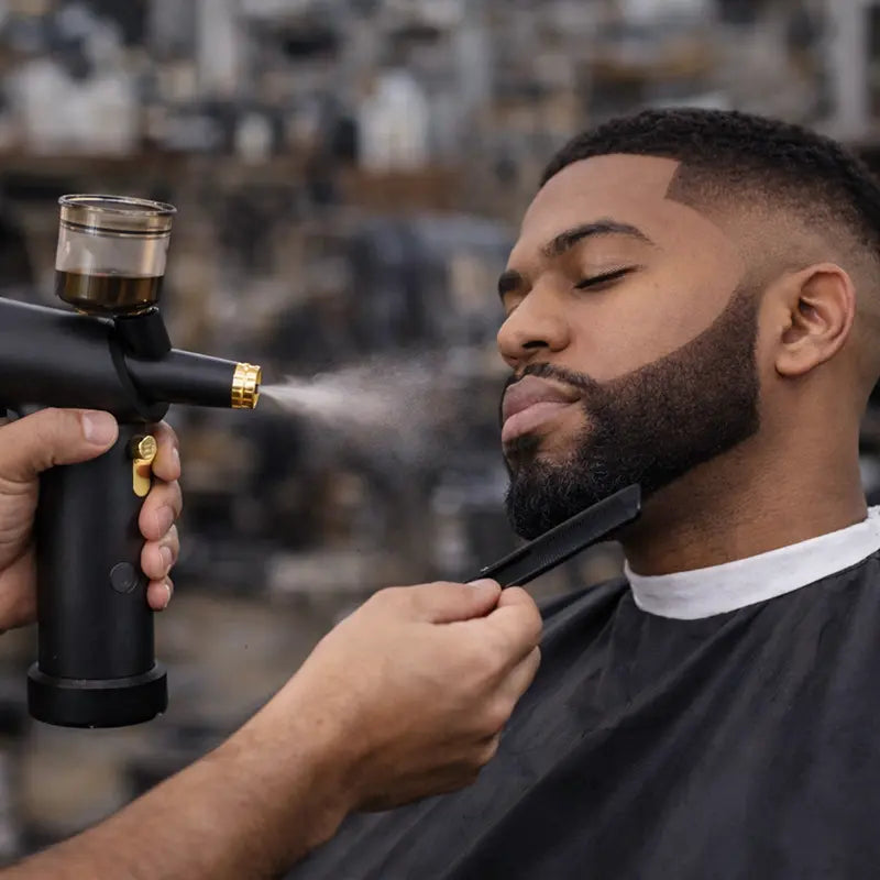 Nicht nur am Kopf, auch im Gesicht zeigt Airbrush seine Stärken. Lückenhafte Bärte können optisch verdichtet, unsymmetrische Konturen perfekt ausgeglichen werden. Die Technik eignet sich hervorragend, um den beliebten "Full Beard Look" zu kreieren, auch wenn der natürliche Bartwuchs eigentlich nicht mitspielt. Dabei arbeitet der Barber mit verschiedenen Brauntönen, um ein möglichst natürliches Ergebnis zu erzielen. Das Resultat hält zwar nur temporär, bietet aber für besondere Anlässe oder Fotoshootings die perfekte Lösung.