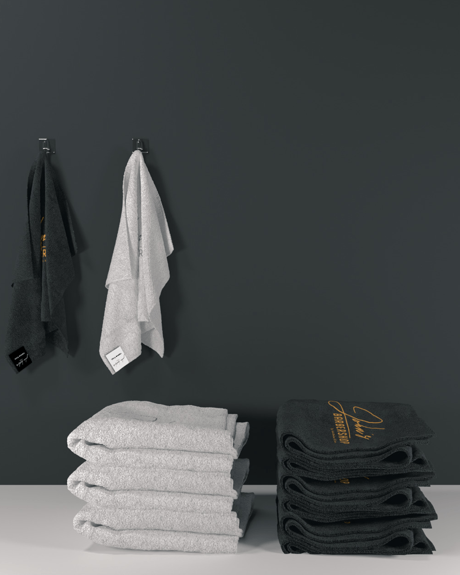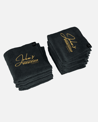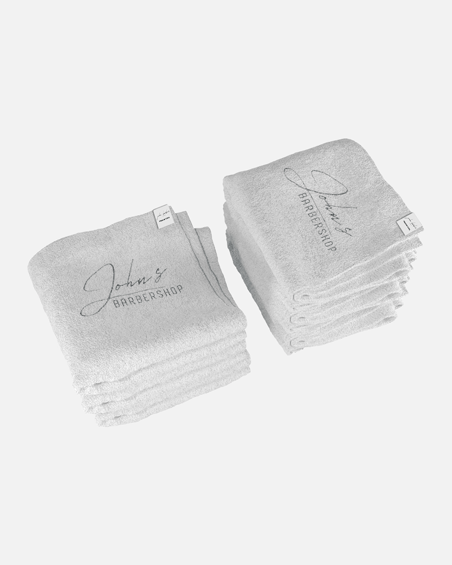Te ofrecemos nuestra "Premium Barbershop & Toallas de salón” en juegos de cinco o diez y en blanco o negro. El logo estará bordado en todas sus toallas, podemos discutir la posición.