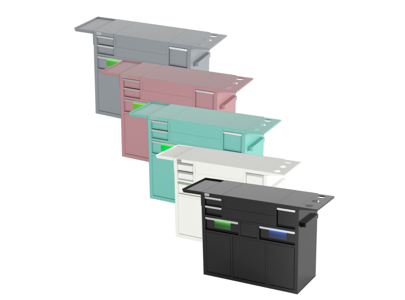 Ana özellikler arasında tekerlekler (lavabolu versiyonlar hariç), yumuşak kapanan çekmeceler, entegre alet tutuculara sahip geniş dolaplar, sağ çekmecede UV sterilizasyon sistemi ve sol çekmecede RGB aydınlatma yer alır — böylece mükemmel atmosferi oluşturabilirsiniz.