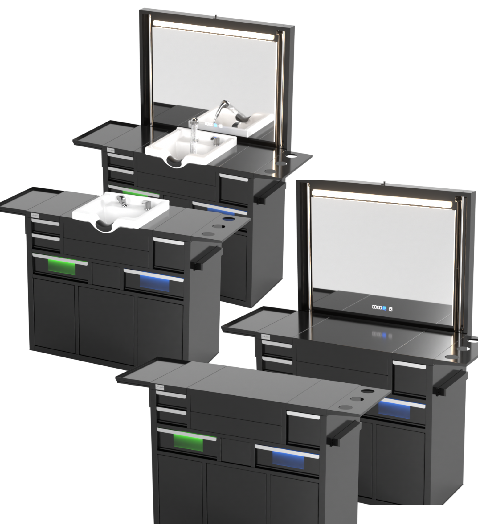 Berber Çalışma İstasyonu "Evolution" – Altı Renk Seçeneği ile Çalışma Alanı – UV Dezenfeksiyon – Lavabo – LED Işıklı Ayna
